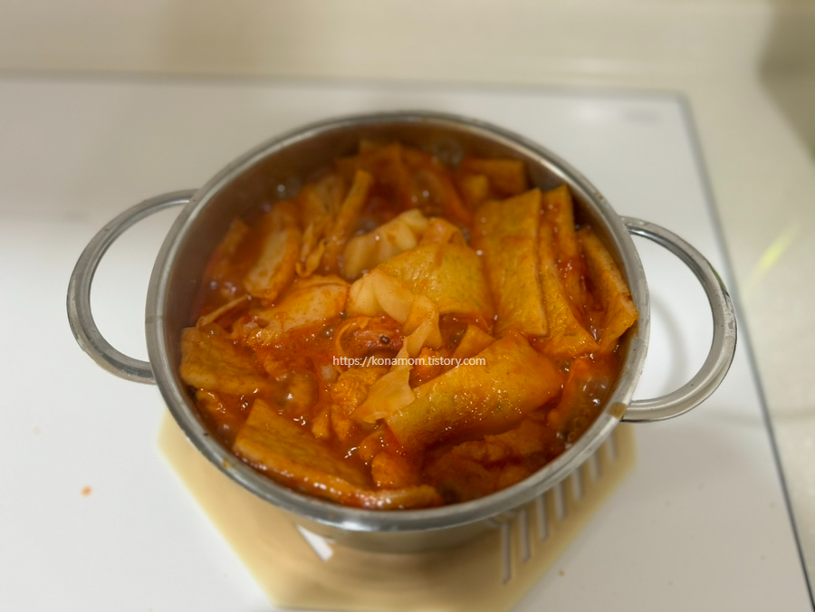 물이 끓기 시작하고 떡볶이 소스를 넣었습니다.