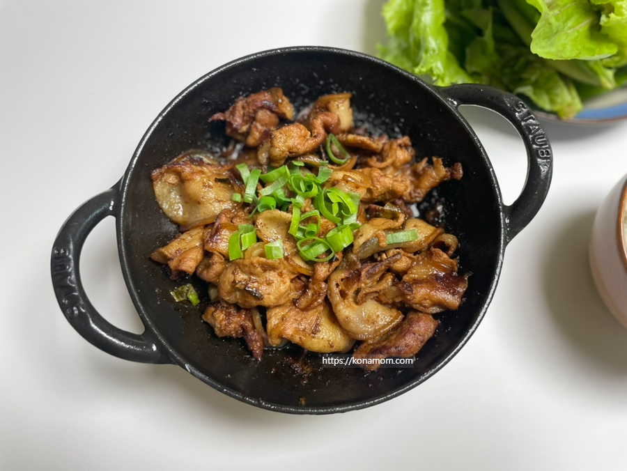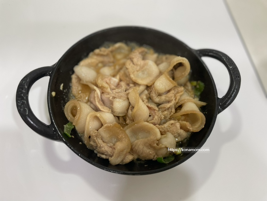 저는 한 번에 다 먹지는 못해서 점심에 혼자 스타우브 베이비웍에도 조리해서 먹고 저녁에 아이와 함께 먹을 땐 프라이팬에 조리했는데요. 요즘 코팅팬을 잘 안 쓰려고 노력하는데, 이 돼지불백은 졸여서 해야 해서 코팅된 팬으로 사용해야 하더라고요.
